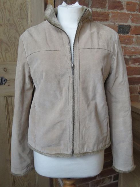 A leather ladies jacket size 14 having faux fur collar.