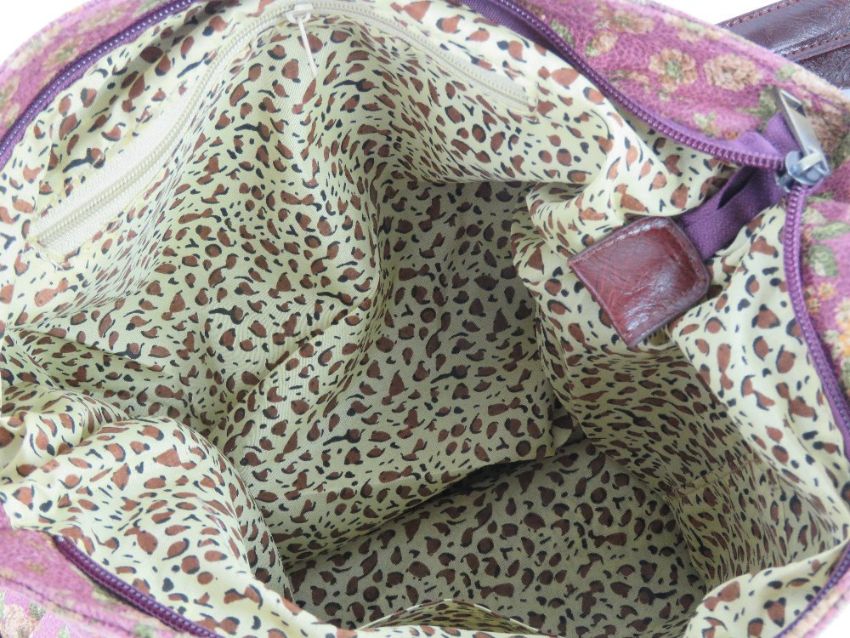 An 'as new' fabric tote bag having floral pattern on purple background 34 x 30cm.