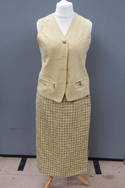 Barry Sherrard; a yellow waistcoat (size 12) and skirt (10) suit, 86% wool, skirt 29" waist, 31" length, waistcoat 38" chest, 22" length to back.