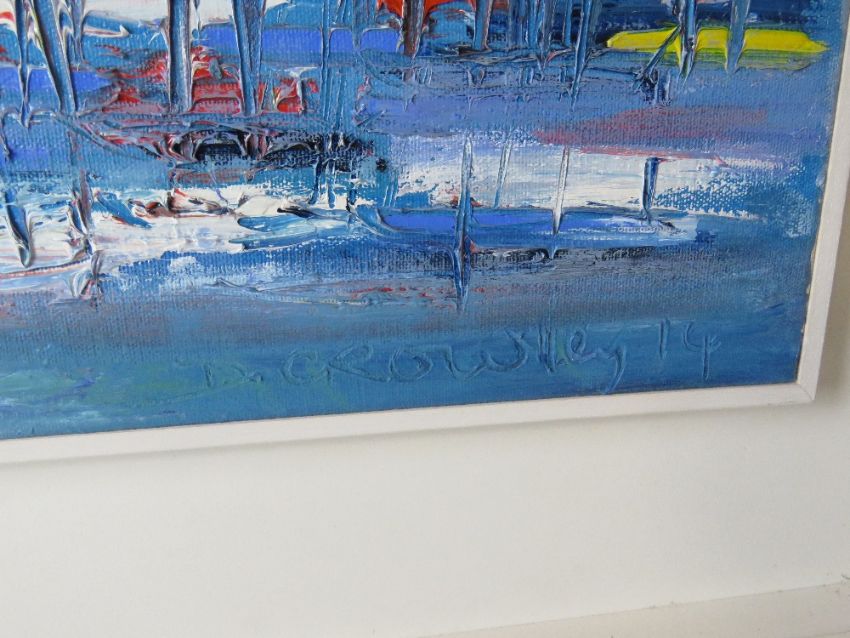 Deirdre Crowley oil on canvas 'Boats' 2014 in white painted wooden frame, signed lower right with details verso, sight size 79.5 x 29.5cm, overall size 101 x 52cm.