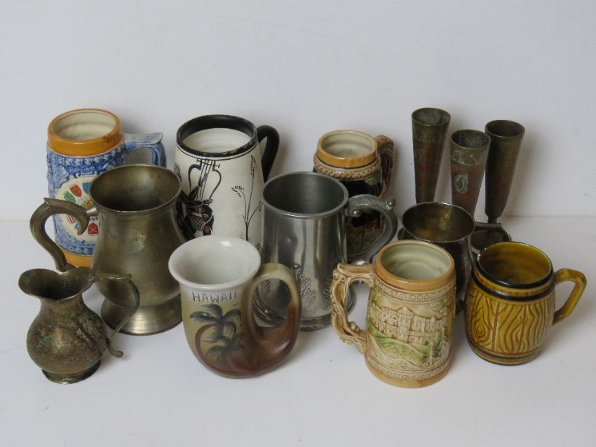 Two silver plated tankards, a pewter tankard, brass 'glasses' and other assorted tankards.