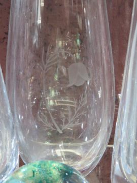 Three etched clear glass bud vases signed indistinctly to bases, together with a green Caithness Scottish glass paperweight. Four items.