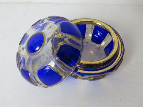 A quantity of assorted glassware including blue and white gilded dressing table pot.