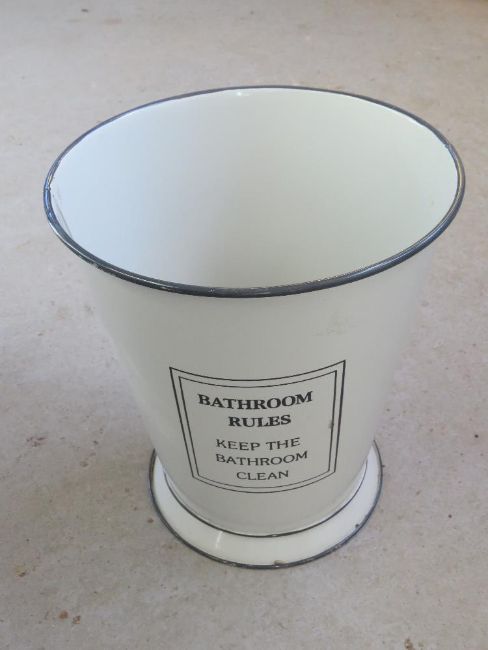A contemporary enamelled type bucket 'Bathroom rules keep the bathroom clean' standing 27cm high.