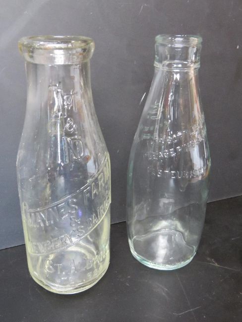 Two vintage clear glass milk bottles, one marked for Maynes Farm and Newbery Dairies St Albans.