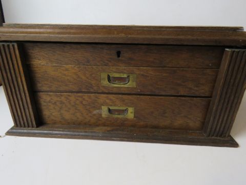 A tabletop campaign box, lid lifting to reveal lined interior with two drawers below, flush drop handles throughout. For restoration. 49cm wide, 33cm deep.