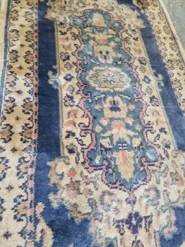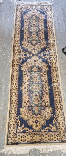 A woollen runner in cream and blue ground in need of cleaning, measuring approx. 240 x 68cm.