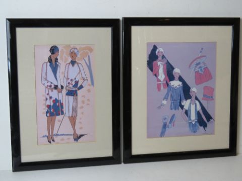 A matched pair of Art Deco style fashion prints in black gloss frames measuring 34 x 40.5cm and 29.5 x 40cm overall respectively.