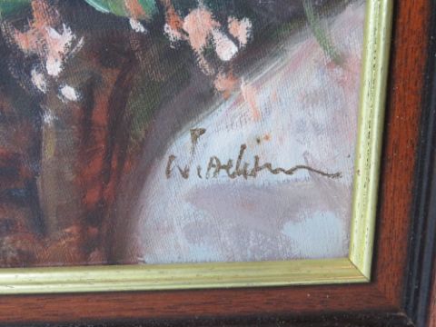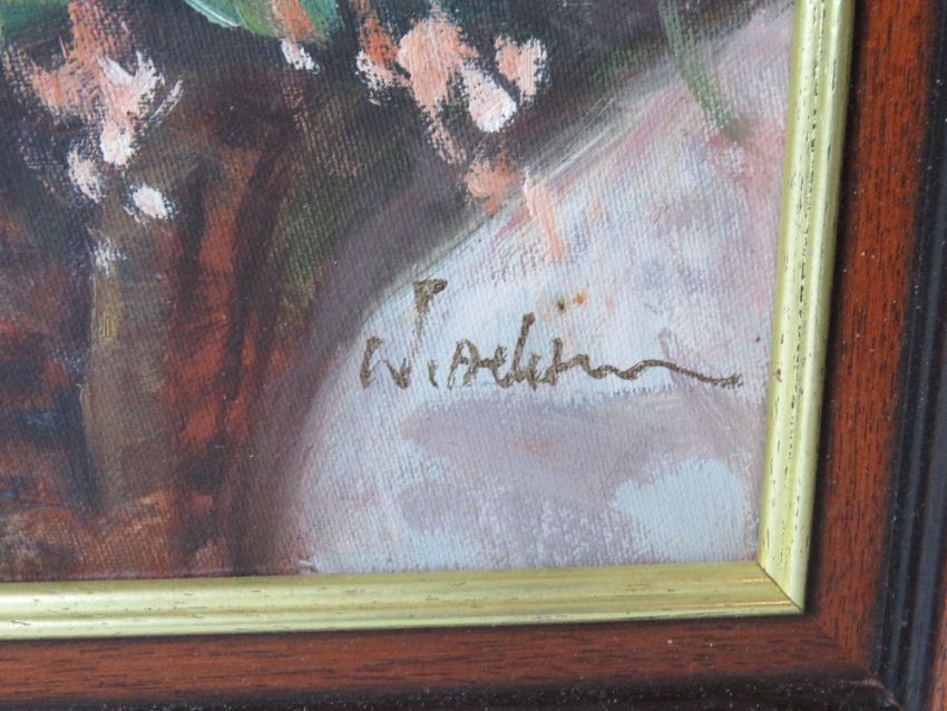 Oil on canvas; still life of pink floral arrangement in jug and bowl, signed indistinctly lower right (W.Adi...?) Sight size 60 x 50cm, frame size 70 x 59.5cm.