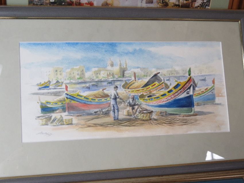 A watercolour together with two prints of Maltese theme including St Paul's Bay. Three items, each framed and glazed, various sizes.