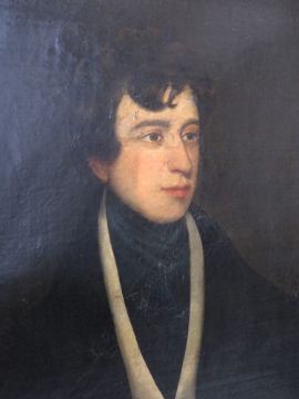 Oil on canvas; A fine early 19thC Regency half length English School portrait of a young Georgian gentleman in waistcoat and black overcoat, unsigned, sight size 61 x 73cm, mounted in wooden frame having silvered recess with carved and gilded composite border, overall size 83 x 95.5cm.