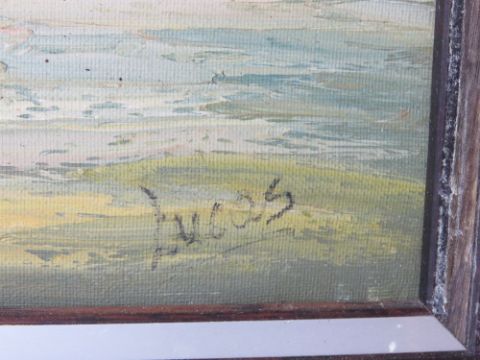 Oil on canvas; Beached fishing boats with sea beyond, tear noted to canvas, framed, signed lower right indistinctly (Lucas?) over size 42 x 50cm.