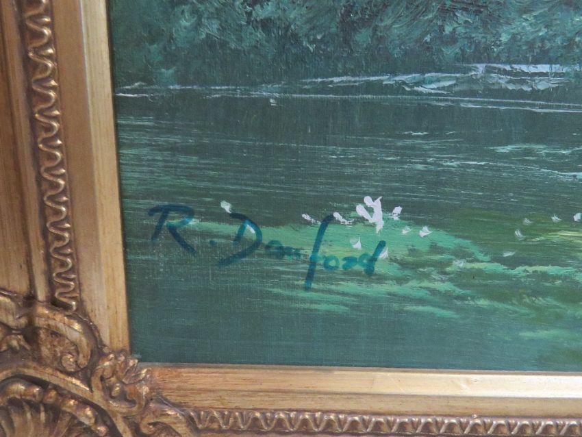 A large contemporary oil on canvas of a river in forest with pair of swans upon, signed R Daufoad. in gold painted composite on pine frame. Overall size 135 x 73.5cm.