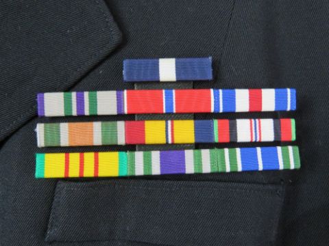 A US Marine Corp tunic and blue trousers, the trousers are a size W-30 and L-31 bearing date of 1957.