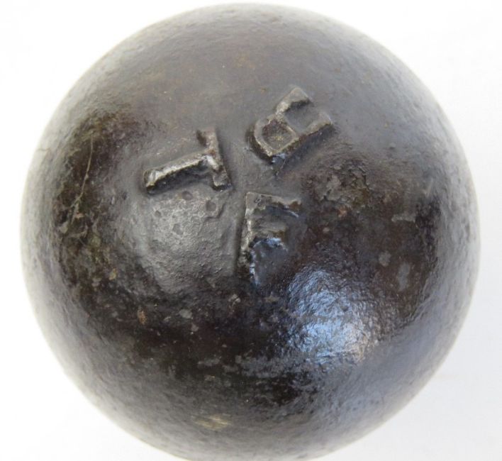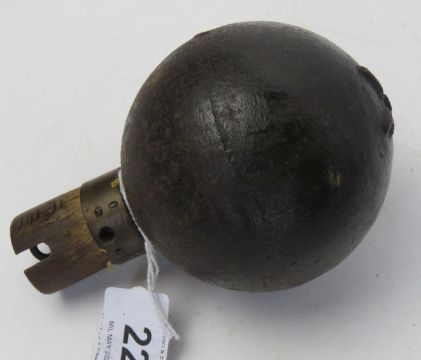 An inert WWI French Model 1915 ball grenade, bears markings RTF on the base.
