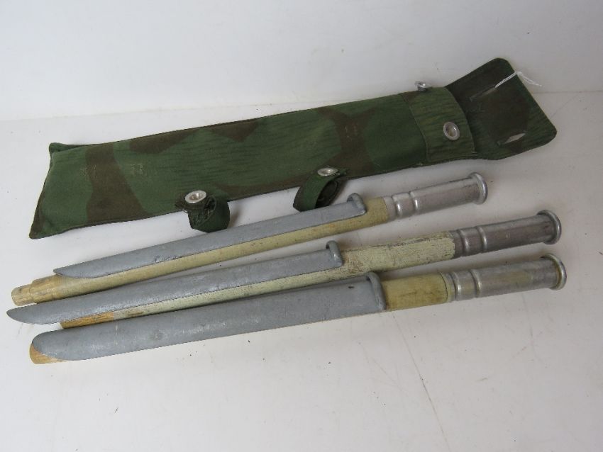 A bag containing WWII German tent pegs and poles, dated 1943, pegs dated 1941.
