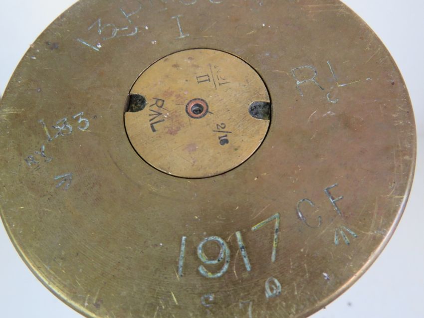 An inert WWI 13 Pounder High explosive Shrapnel QF (Quick Fire) Cannon shell with fuse timer, case dated 1917.