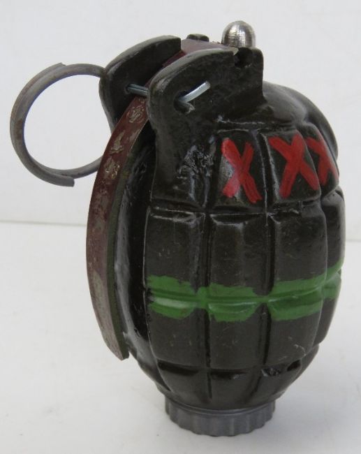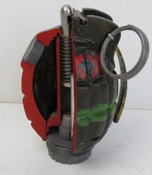 An inert resin No.36 Mills cutaway grenade.