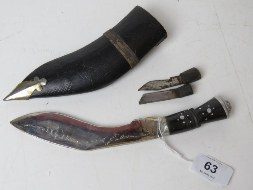 A Gurkha Kukri knife with scabbard, with the Karda and Chakmak blades, some surface rust on the blade.