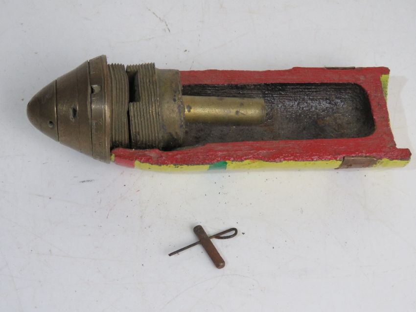 A WWI three inch cutaway HE shell with timer dated 1944.