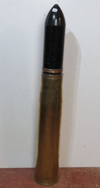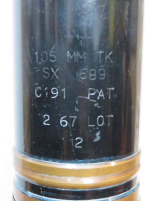 An inert 105mm TK HESD shell, the case dated 1986 with clear markings, projectile marked 105mm TK SX 689 C191 PAT 2 67 LOT 2, approx. 97cm in length.