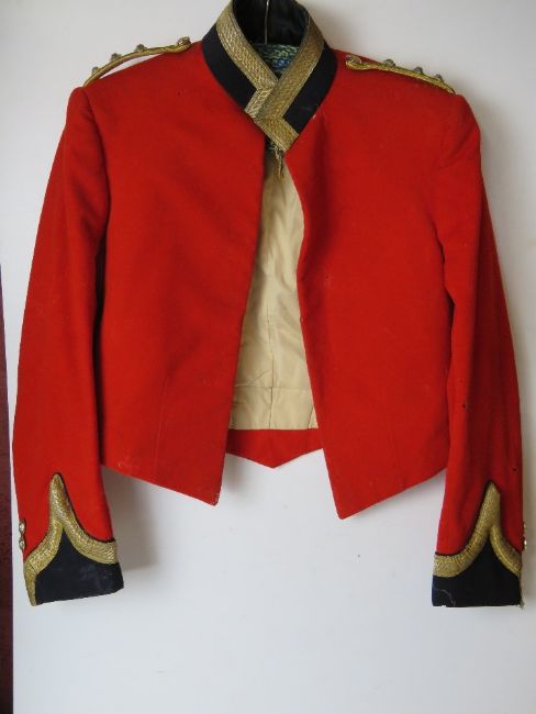 A red military jacket having buttoned and shoulder cords upon, a/f, heavy mothing.