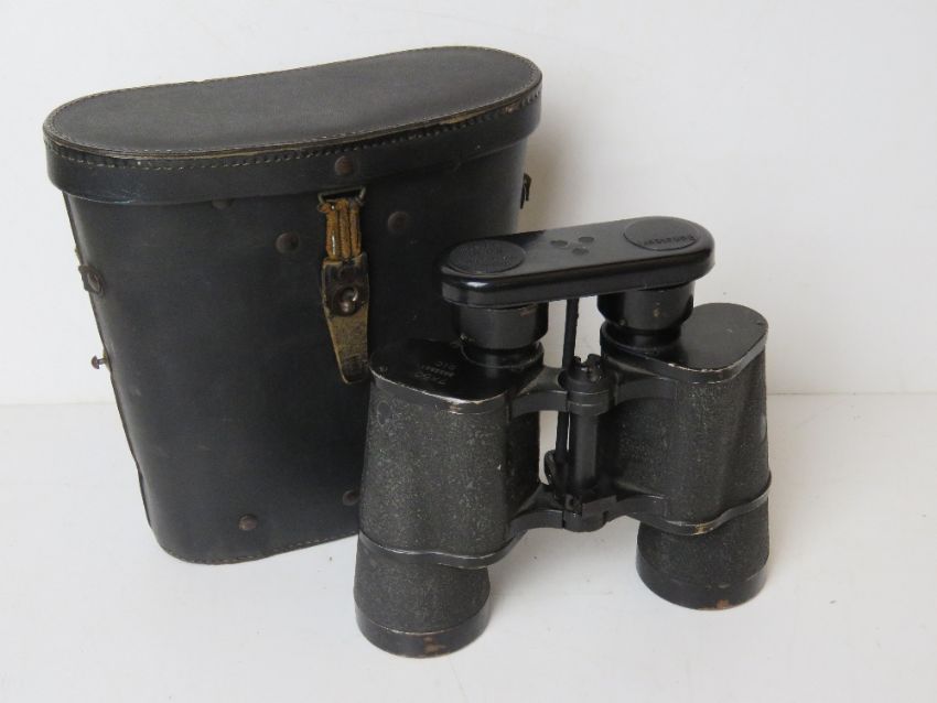 A pair of WWII German 7x50 binoculars in Kriegsmarine case, with Bakelite top lens cover, bearing maker's mark blc , serial number 2225351 with optics. Case bears Waffenamt stamp to the top, base stamped Kriegsmarine.