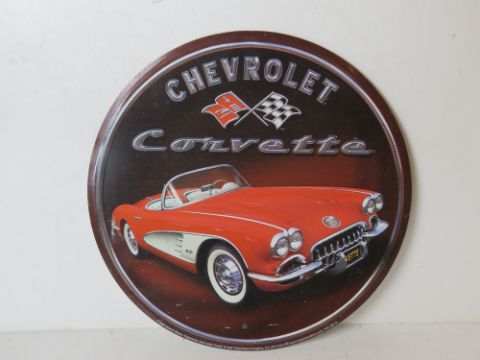 A contemporary metal Chevrolet Corvette sign measuring approx 30.5cm dia.