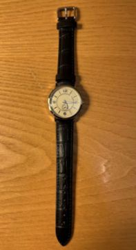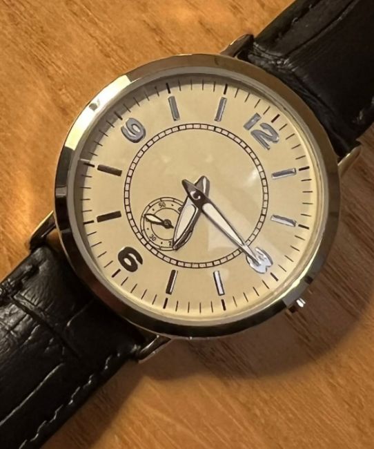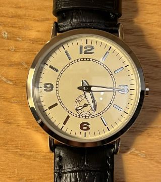 Mercedes Ladies Watch with Bag & Box. Highly rare- new old stock dating to early 2000s. Watch with primrose ground face, Arabic numerals at the cardinal points, luminous baton hands and subsiduary seconds dial and complete with genuine black leather Time Veranda strap. With Mercedes cloth bag and original box with label.