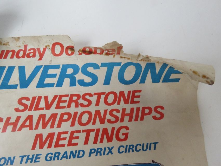 An original Silverstone poster c1970s for the Silverstone Championships Meeting on the Grand Prix Circuit, organised by the British Racing Drvier's Club, designed by Paul Torr in white ground with red and blue text. Measuring 62.5 x 45cm.