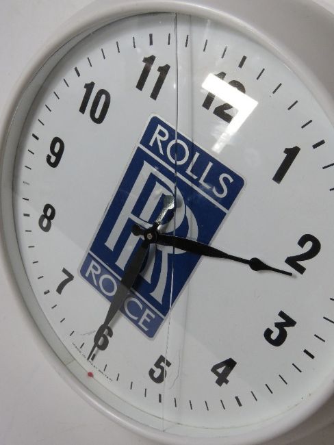 A c1960s Smiths 12" dial wall clock having Rolls Royce motif upon and later fitted quartz movement. Cream face with Arabic numerals. Glass a/f.