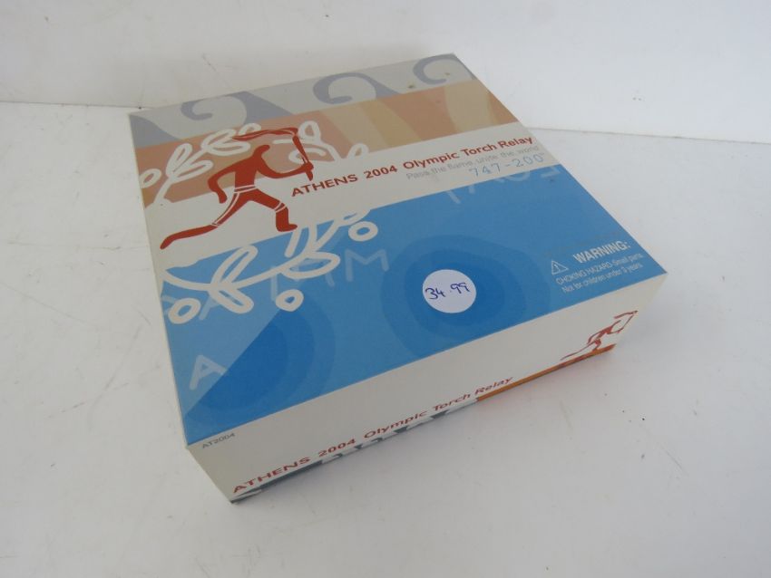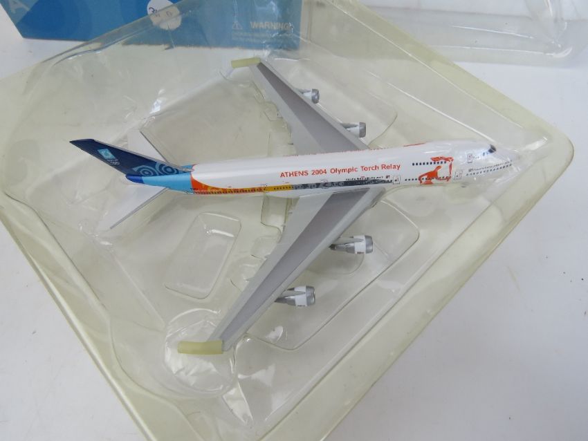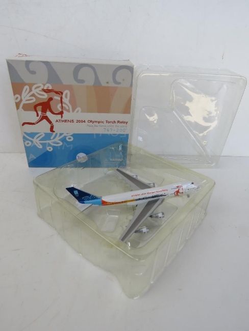 A die cast scale model Boeing 747-200 in Athens 2004 Olympic Torch Relay livery, in original packaging.