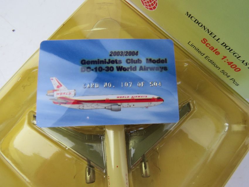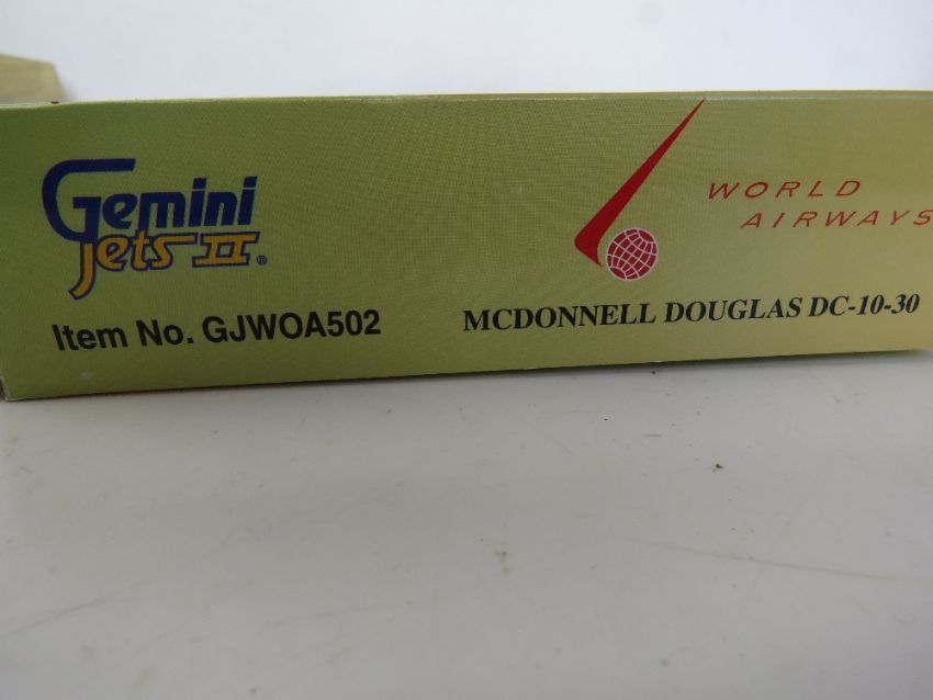 A Gemini Jets II Limited Edition scale model of McDonnell Douglas DC-10-30 in World Airways livery, 1:400 scale, in original packaging, complete with Gemini Jets Club 2003/2004 card No 107/504. Item No GJWOA502.