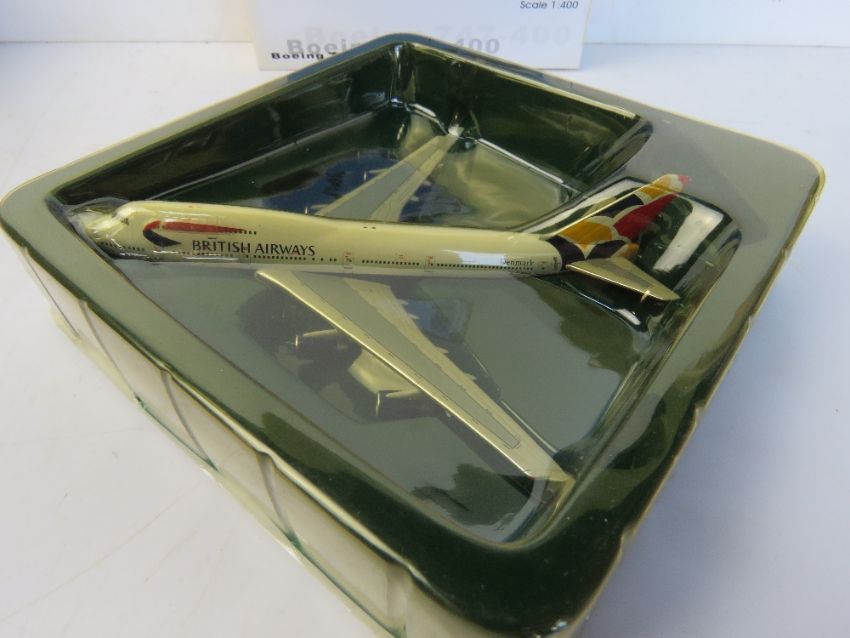 A Net Models-400 die cast scale model Boeing 747-400 in British Airways 'Denmark' livery, 1:400 scale, in original packaging.