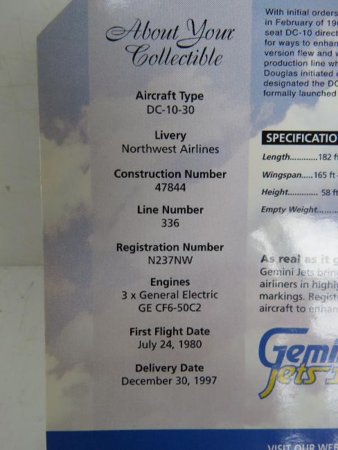 A Gemini Jets II Lmited Edition die cast scale model McDonnell Douglas DC-10-30 in NorthWest Airlines livery, Registration N237NW, 1:400 scale, in original packaging.