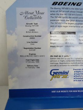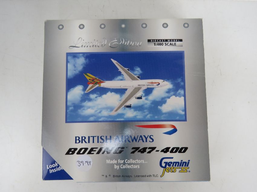 A Gemini Jets II Limited Edition die cast scale model Boeing 747-438 in British Airways livery, Registration GCIVP, scale 1:400 in original packaging.