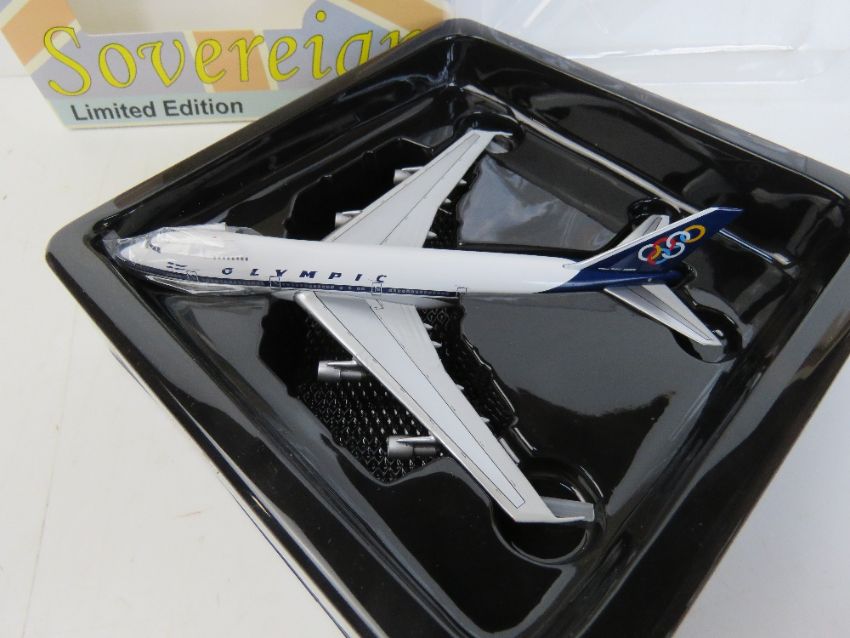A Sovereign Limited Edition die cast scale model Boeing 747-200 in Olympic livery, 1:400 scale, in original packaging, box slightly a/f (needs re-gluing).