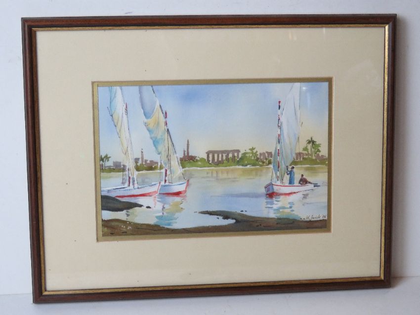 Watercolour; Egyptian fisherman on the Nile with temples beyond signed K. Jurick and dated 2006, framed and glazed, sight size 26 x 17cm overall 42 x 32cm.