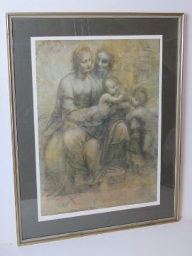 Ecclesiastical print; two classical women with cherubic children at feet, sight size 53 x 39cm, framed and glazed overall size 69 x 55cm.