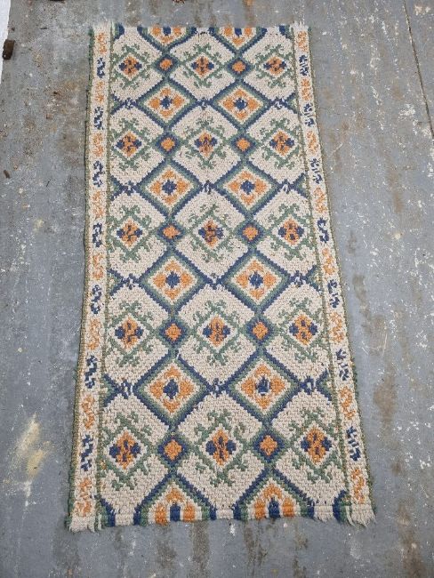A hand woven rug in yellows, blues and greens measuring approx. 142 x 70cm.