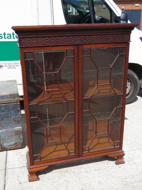 An Edwardian mahogany twin door floorstanding display cabinet, astral glazed doors opening to reveal shelves within, wired for electric lighting, 98 x 31 x 137cm.