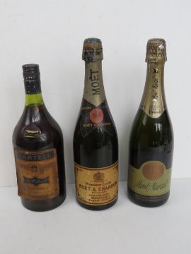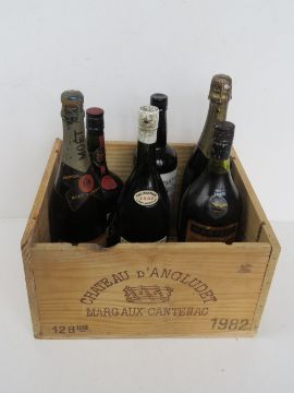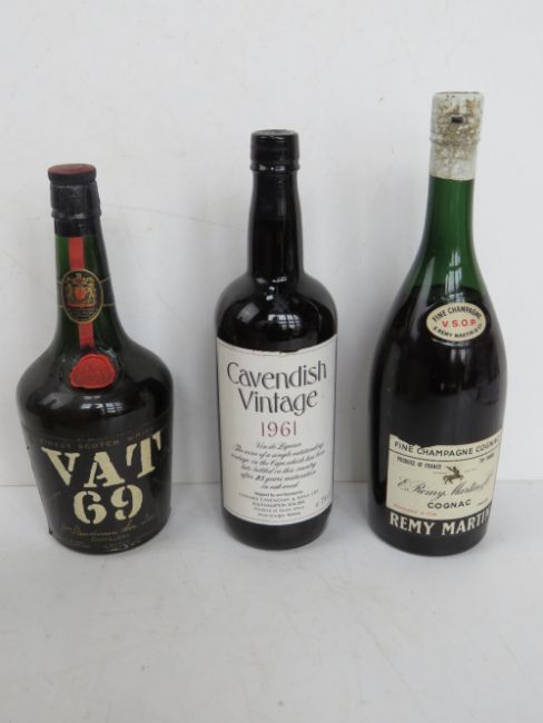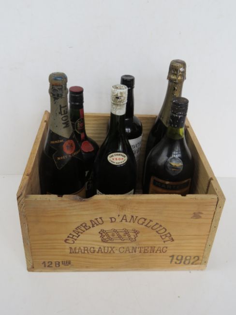 A quantity of assorted bottles of alcohol including Harrod's Mont-Marcal Cava, Moet & Chandon champagne, VAT 69 whisky, Remy Martin VSOP, Martell Cognac and Cavendish vintage 1961 Vin de Liquer. Six items within wooden wine crate (no lid).