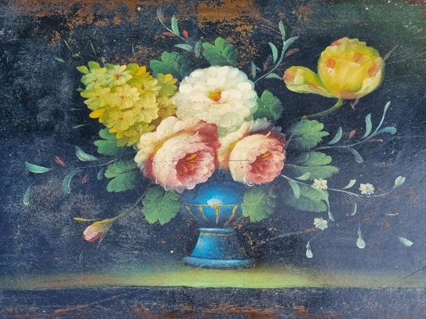 A coffee table having floral still life painting upon, central drawers with hidden drawers flanking.