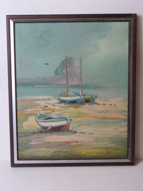 Oil on canvas; Beached fishing boats with sea beyond, tear noted to canvas, framed, signed lower right indistinctly (Lucas?) over size 42 x 50cm.