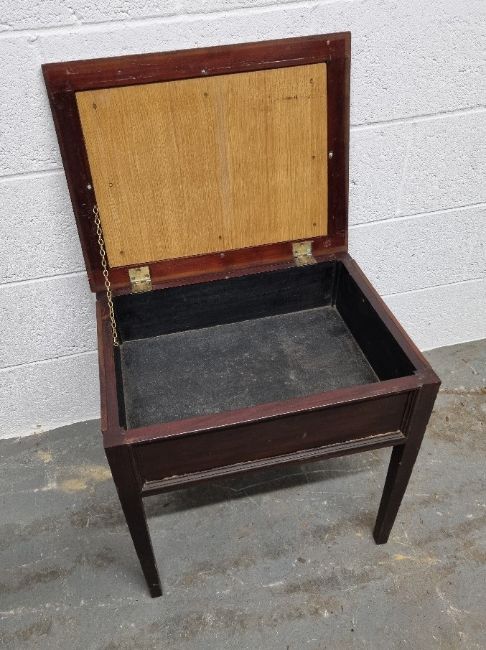 A piano stool having floral embroidered seat pad opening to reveal compartment within, 51cm wide.