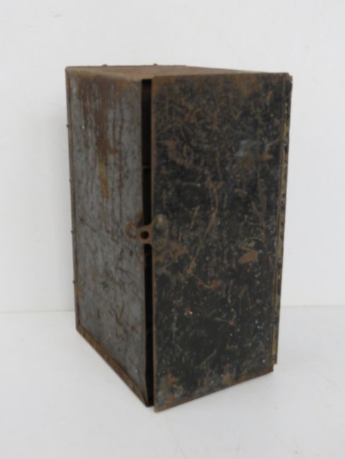 Vintage metal lock box opening to reveal 4 drawers within measuring approx. 17.5 x 27 x13cm.