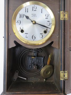 A Royal Aporo wall clock having silvered dial with black Arabic numerals upon, having key and pendulum within, 47cm in length.