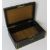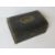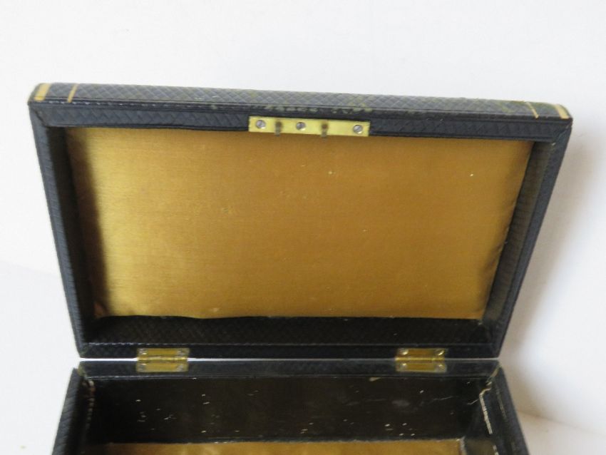 A delightful vintage green leather covered jewellery box having gilt decoration, inset brass handle and opening to reveal gold coloured silk lining within. Measuring approx 23cm wide.