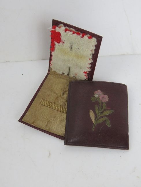 A chrome cigarette case, a Coty Harris compact, a bone and brass jewellery box and a leatherette needle case. Four items.