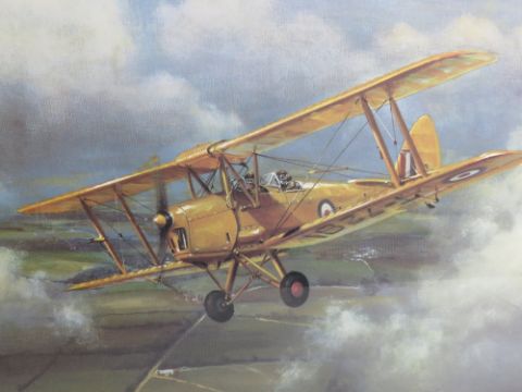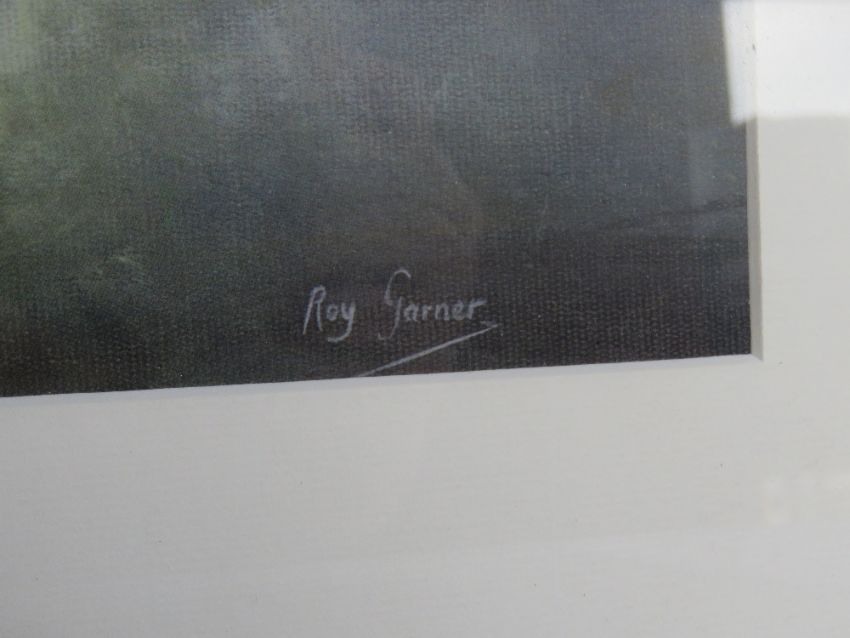 Aeronautical print from an original painting by Roy Garner of a glider plane, sight size 39 x 30cm, framed and glazed, overall size 54.5 x 46cm.
